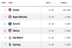 Opta超算給出了最新的歐冠奪冠概率,目前阿森納34.34%居首,拜仁第二,巴黎和馬競(jìng)分列三四,皇馬僅3.48%位居第五。