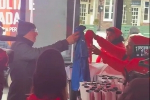 在隊伍的最前端,可以看到球迷們進入一棟建筑領取加拿大的球衣,視頻中有一名球迷將一件藍色的意大利兒童球衣交給志愿者,后者遞給他一件紅色的加拿大球衣。實際上,志愿者們并沒有真的在收集意大利球衣,只是為了免費發(fā)放加拿大球衣。