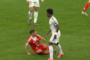 比賽第9分鐘,維尼修斯拼搶時(shí)先是絆倒了基米希,然后又上手將本就倒地的后者一把推翻,被裁判口頭警告。