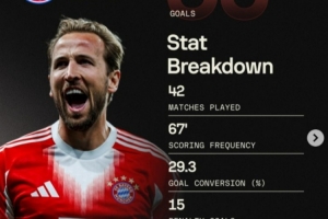 凱恩賽季50球具體數(shù)據(jù):每67分鐘一球,射門轉(zhuǎn)化率29%,6粒遠(yuǎn)射