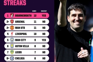 本賽季英超連續(xù)不敗場(chǎng)次榜:伯恩茅斯12場(chǎng)居首,阿森納、曼聯(lián)11場(chǎng)