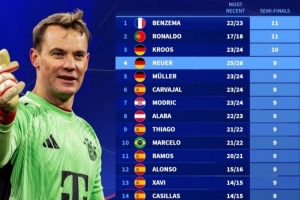 體育資訊4月16日訊 今天凌晨,拜仁淘汰皇馬進入歐冠四強,諾伊爾已經(jīng)9次參加歐冠四強,并列第三。