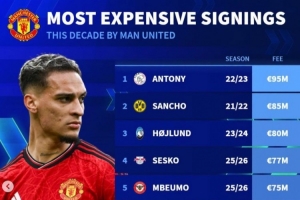 體育資訊4月19日訊 《轉(zhuǎn)會市場》統(tǒng)計了曼聯(lián)自2020年以來的最貴引援情況,B費僅位列第9位。