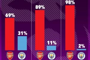 OPTA對三種賽果對爭冠的影響進(jìn)行了預(yù)測,若曼城贏球,阿森納奪冠概率仍有69%,而若阿森納贏球,奪冠概率將升至98%。