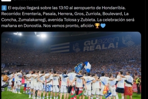 皇家社會官方社媒公布了奪冠慶祝游行安排:“球隊將于13:10左右(北京時間19:10)抵達洪達里維亞機場。冠軍巡游路線為倫特里亞、帕薩亞、埃雷拉、格羅斯、蘇里奧拉、林蔭大道、貝殼海灘、蘇馬拉卡雷吉、托洛薩大道和祖比埃塔。