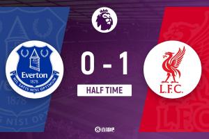 上半場(chǎng)補(bǔ)時(shí)2分鐘,埃弗頓0-1利物浦。