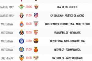 體育資訊4月21日訊 西甲官方公布了第36輪賽程安排,馬競、巴薩和皇馬將分別在北京時(shí)間5月13日、14日和15日凌晨出戰(zhàn)。