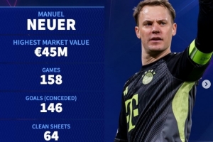 德轉(zhuǎn)也列出了諾伊爾(巔峰身價(jià)4500萬歐元)歐冠生涯關(guān)鍵數(shù)據(jù):出戰(zhàn)158場,丟146球,完成64次零封,平均每93分鐘丟1球。