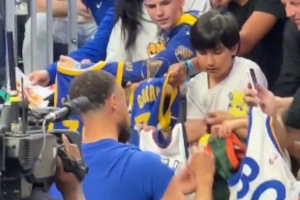 賽前勇士給場邊的球迷們簽名互動,場面火爆。