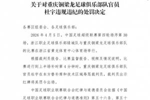 體育資訊04月08日訊 中足聯(lián)官網(wǎng)今日公布處罰決定,中超第4輪,浙江vs重慶銅梁龍,重慶銅梁龍助理教練杜宇辱罵裁判員,禁止進(jìn)入體育場(chǎng)6場(chǎng),罰款6萬元。