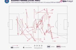 數(shù)據(jù)統(tǒng)計(jì)顯示,維蒂尼亞半場(chǎng)便完成了65次傳球,而利物浦全隊(duì)共計(jì)僅82次。