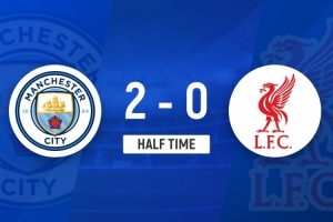 傷停補(bǔ)時(shí)2分鐘。上半場比賽結(jié)束,曼城2-0利物浦。
