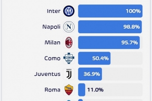 體育資訊4月9日訊 意甲第31輪比賽之后,國(guó)米以7分的優(yōu)勢(shì)領(lǐng)跑積分榜。足球數(shù)據(jù)分析機(jī)構(gòu)Football Meets Data對(duì)各隊(duì)進(jìn)入前4的概率進(jìn)行了預(yù)測(cè),國(guó)米、那不勒斯和米蘭基本確定前四位置,科莫50.4%,尤文36.9%,羅馬僅有11%。