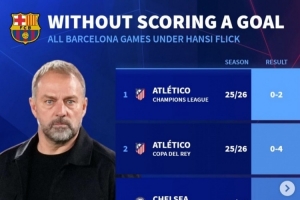 體育資訊4月9日訊 歐冠1/4決賽首回合比賽,巴薩主場0-2不敵馬競,據(jù)德國轉(zhuǎn)會(huì)市場統(tǒng)計(jì),弗里克執(zhí)教巴薩以來僅5場比賽被零封,其中2場就是對陣馬競。