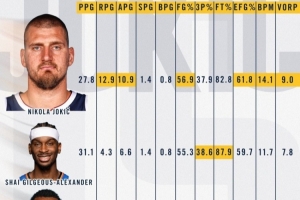 約基奇在場(chǎng)均籃板、助攻、投籃命中率、有效命中率、基礎(chǔ)正負(fù)值(BPM)和替代球員價(jià)值(VORP)六項(xiàng)數(shù)據(jù)方面都排在四位MVP候選人中的首位。