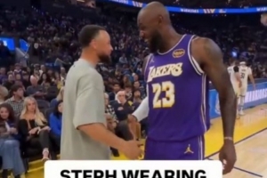 詹姆斯和庫里賽前開心寒暄 鏡頭給到庫里穿的詹姆斯10代簽名鞋