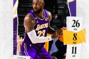 賽后,湖人官方發(fā)布詹姆斯本場(chǎng)26+8+11數(shù)據(jù)海報(bào)。