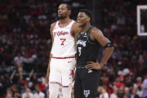 賽后,愛德華茲和杜蘭特擁抱致意,當被問及兩人對話內(nèi)容時,愛德華茲笑著說道:“我在跟他要球衣,我已經(jīng)有一些了,但還想要一件。”