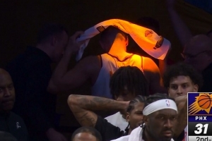 太陽(yáng)球員格雷森·阿倫在進(jìn)攻中受傷,據(jù)太陽(yáng)隊(duì)記Amanda Pflugrad報(bào)道,阿倫在離場(chǎng)時(shí)捂著自己的左腿筋。