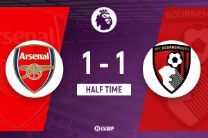 上半場補(bǔ)時(shí)2分鐘。半場戰(zhàn)罷,阿森納1-1伯恩茅斯。
