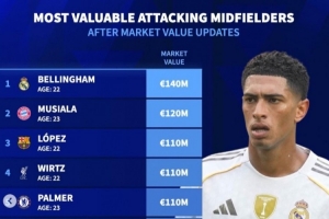 體育資訊4月11日訊 《轉(zhuǎn)會市場》統(tǒng)計了前腰位置球員身價情況,貝林厄姆力壓穆西亞拉居首。