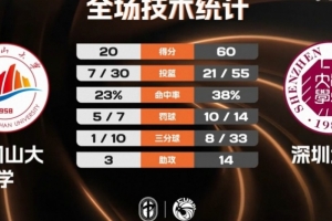 末節(jié)決戰(zhàn),井岡山大學(xué)依然半節(jié)多時(shí)間內(nèi)一分未得,李魯粵連續(xù)籃下取分幫助深圳大學(xué)領(lǐng)先到40分以上。楊涵銀造殺傷終于止血,但孫琦越三分再命中回應(yīng),時(shí)間所剩無(wú)幾,最終深圳大學(xué)60-20大勝井岡山大學(xué)。