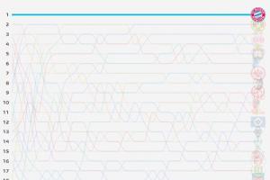 數(shù)據(jù)機(jī)構(gòu)Football Meets Data曬出了本賽季德甲排名的走勢圖,拜仁從首輪6-0萊比錫開始,一直穩(wěn)坐榜首。相比之下其余17支的球隊(duì)的排名則不斷上下變動(dòng)。