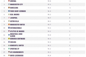 體育資訊4月13日訊 著名數(shù)據(jù)機(jī)構(gòu)OPTA對(duì)全球超過(guò)10000家俱樂(lè)部打造了一個(gè)評(píng)分系統(tǒng),評(píng)分范圍從0到100。其中,0分代表全球最弱的球隊(duì),而100分則代表全球最強(qiáng)的球隊(duì)。在OPTA全球俱樂(lè)部實(shí)力榜中,拜仁、阿森納、曼城、巴薩以及巴黎圣日耳曼位居前五。