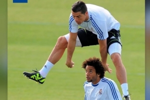 馬塞洛曬出與C羅在皇馬效力期間的合照,內(nèi)容為C羅從馬塞洛的頭上跳過,馬塞洛一臉驚訝。