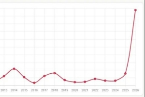 這張折線圖展示了在2010年至2026年間,關(guān)鍵詞“擺爛”在每1000條謠言中的提及次數(shù)的變化趨勢。